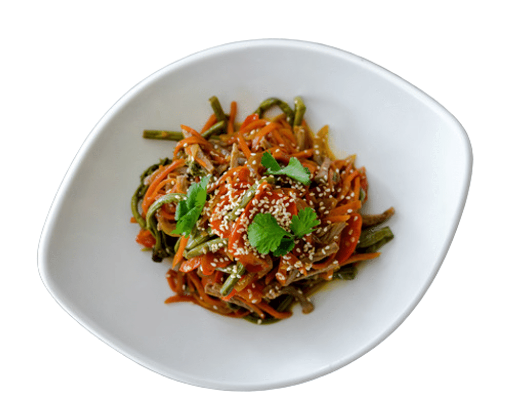 Папоротник, перец болгарский, морковь, лук репчатый, говядина, соус Мирин, масло растительное, соус Киккоман, лук зеленый, дашида, кунжутная семечка, кинза