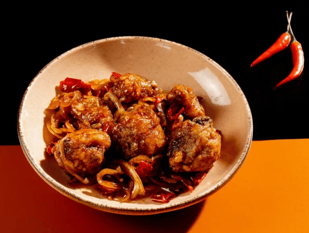 Острое блюдо! Окорочка, лук репчатый, масло растительное, крахмал, соевый соус, перец стручковый
