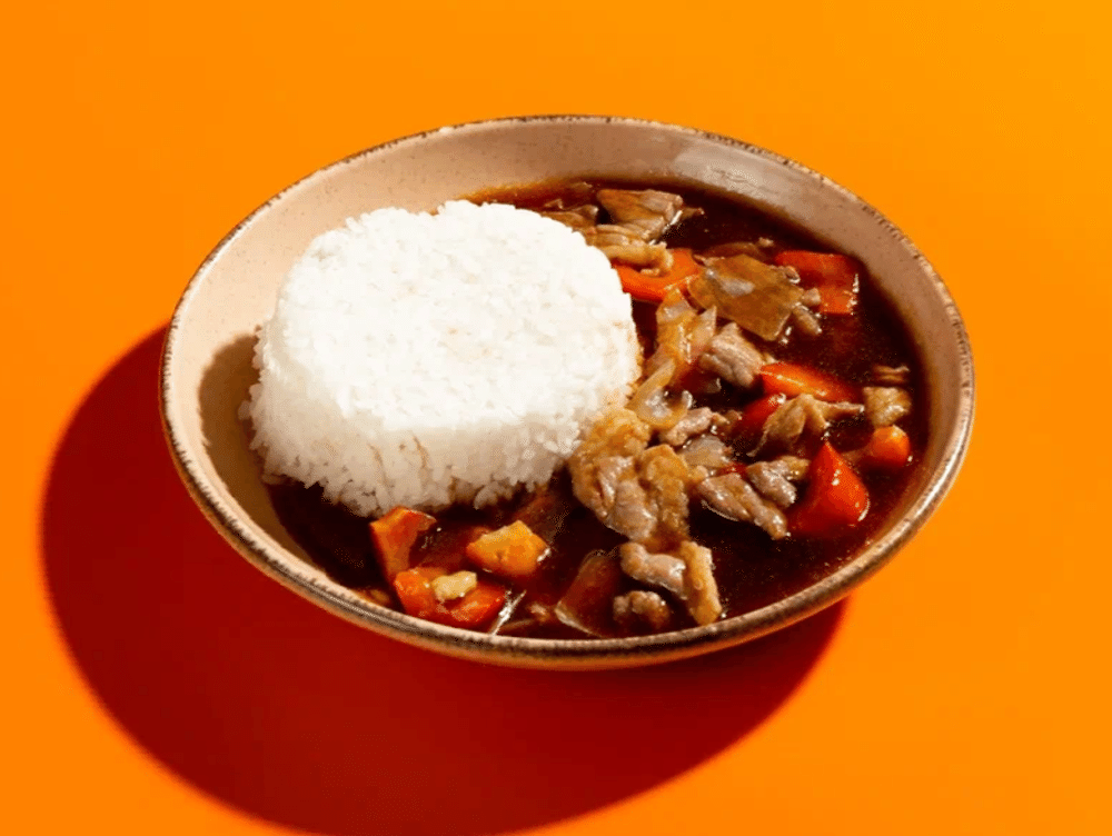 Рис, соус "Веревочка", говядина, масло растительное, лук репчатый, перец болгарский, крахмал, чеснок