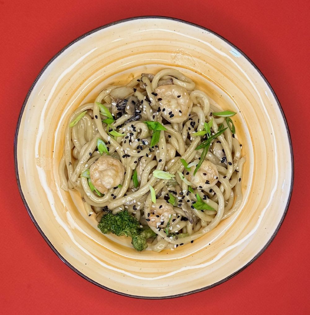 Лапша на выбор, креветки, масло растительное, сырно-сливочный соус, соус Терияки, шампиньоны, брокколи, кунжутная семечка