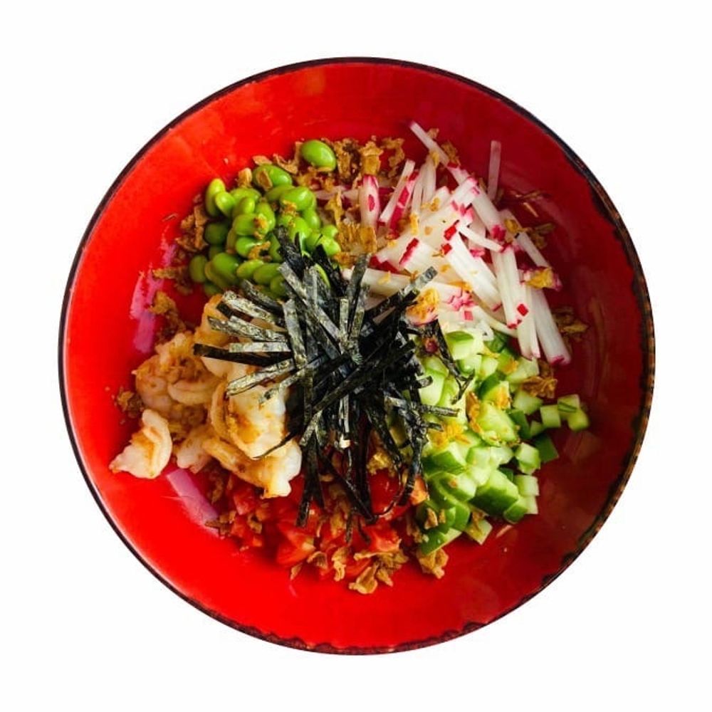 Рис, ореховый соус, креветки тигровые, огурцы, бобы, помидоры черри, редиска, лук жареный, лист нори