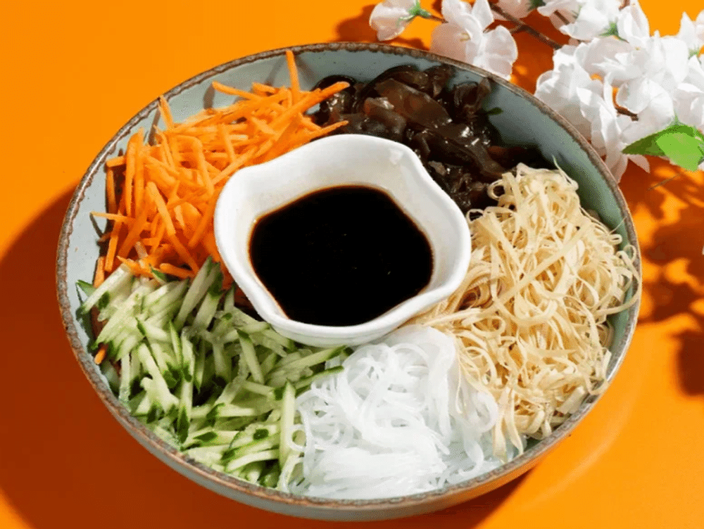 Карбонат, фунчоза тонкая, огурцы, морковь, черные грибы, кантофу, соевая паста не острая, масло растительное, соевый соус