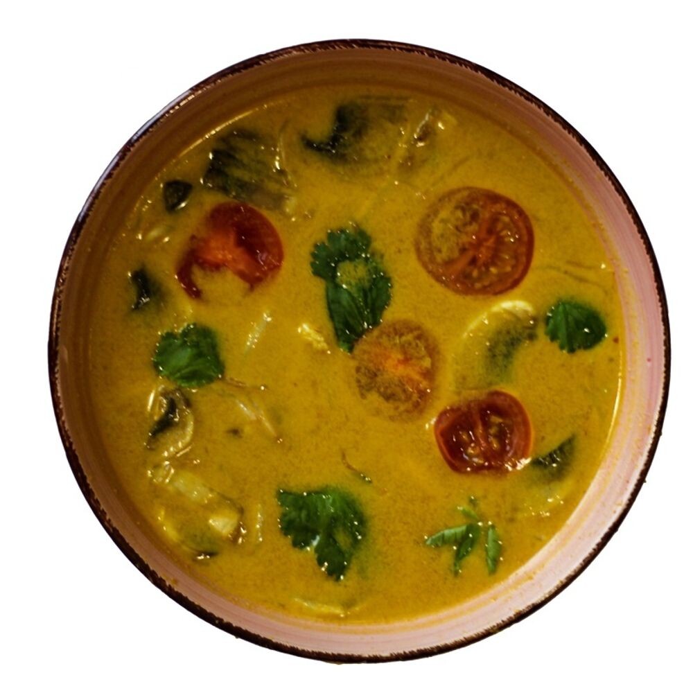 Рис, кокосовое молоко, филе куриное, шампиньоны, ростки сои, паста карри, сахар, помидоры черри, перец чили