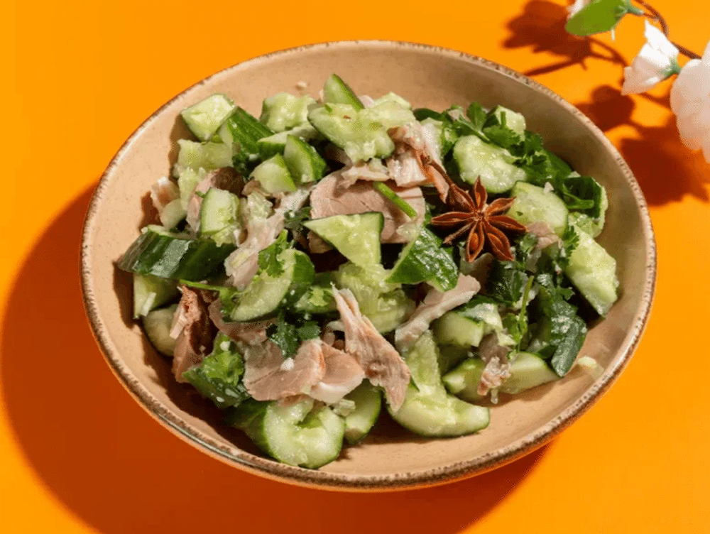 Рулька, огурцы, соевый соус, масло растительное, кинза, кунжутное масло, уксус черный, куриная мука , сахар, чеснок, соль